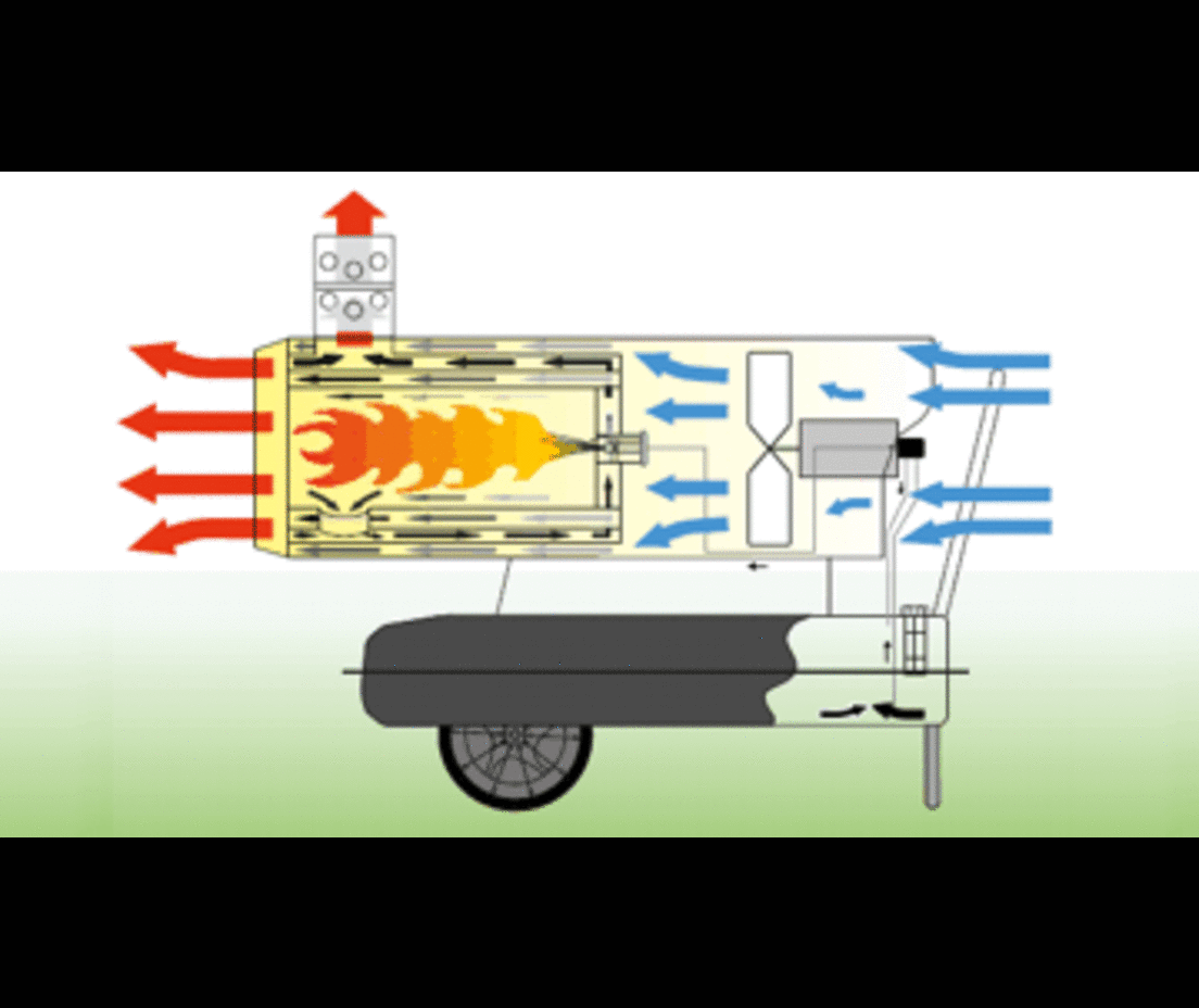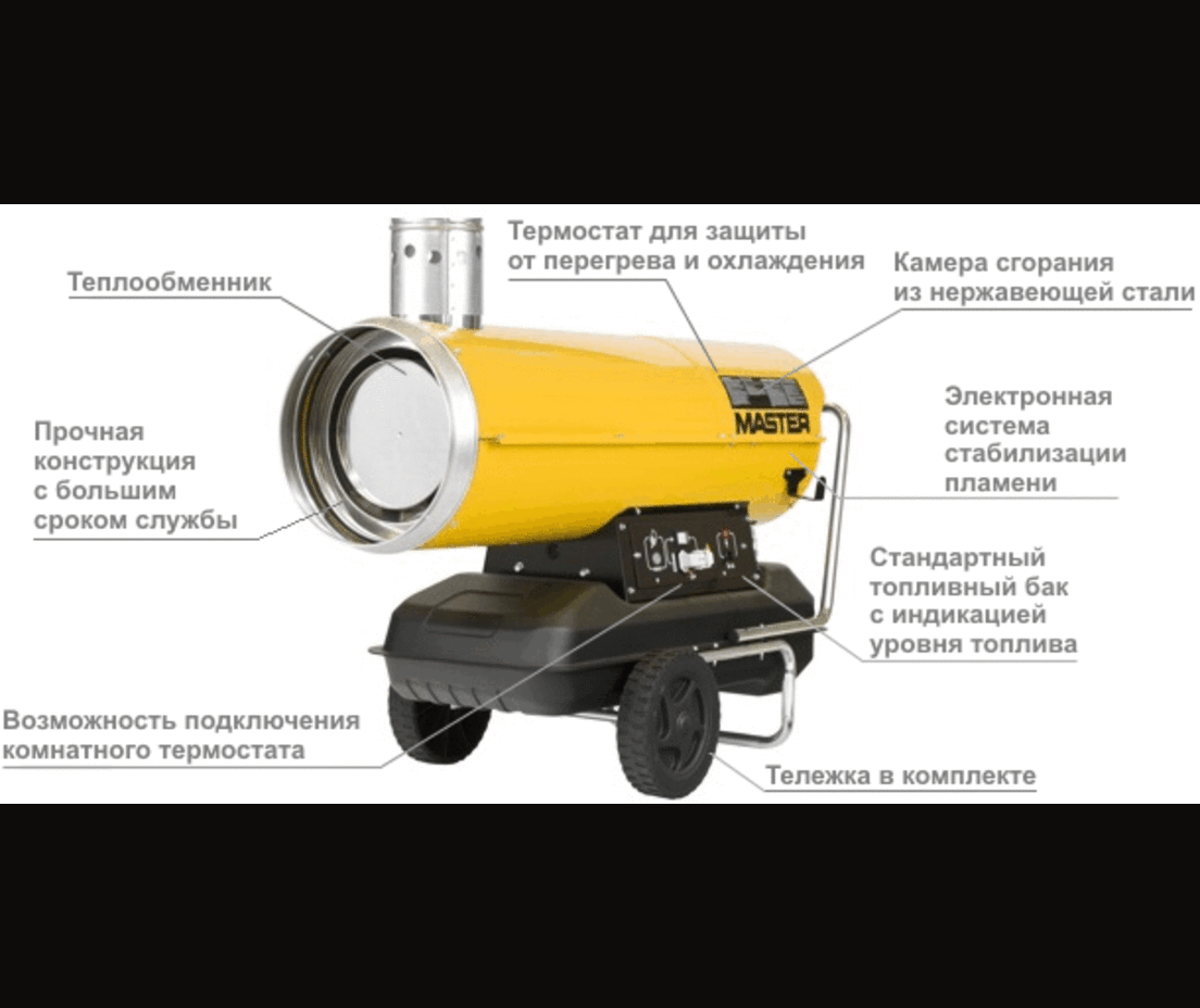 Система стабилизации пламени и камера сгорания из нержавеющей стали обеспечивают надежную и безопасную эксплуатацию устройства. Пушка оборудована топливным баком ёмкостью 65 литров, которых хватит на 21 час автономной работы без дозаправки. Что касается продуктов горения, их отвод осуществляется через специальную систему на улицу, что позволяет эксплуатировать оборудование в закрытых помещениях, в которых работают люди.
