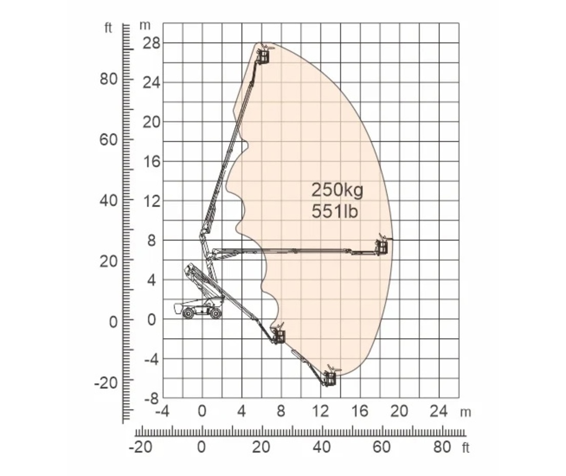 Максимальная рабочая высота составляет 28.1 м, максимальная нагрузка составляет 250 кг, дизельный двигатель Deutz является источником питания.