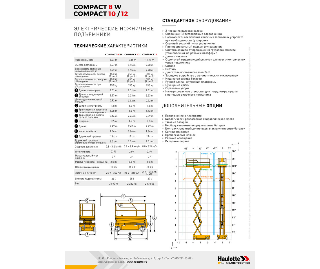 Ножничный дизельный подъемник Haulotte Compact 12 подходит для выполнения монтажных или строительных работ на небольшой высоте. Модель оснащена платформой размером 2.49 х 1.54 м, которая позволяет с удобством размещаться рабочим и строительному инструменту. Установка отвечает всем требованиям безопасности. Подъемник подходит для эксплуатации на неровных поверхностях.