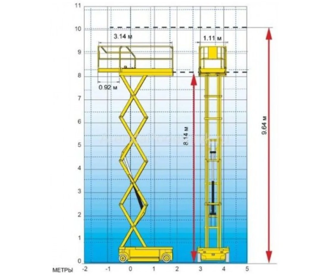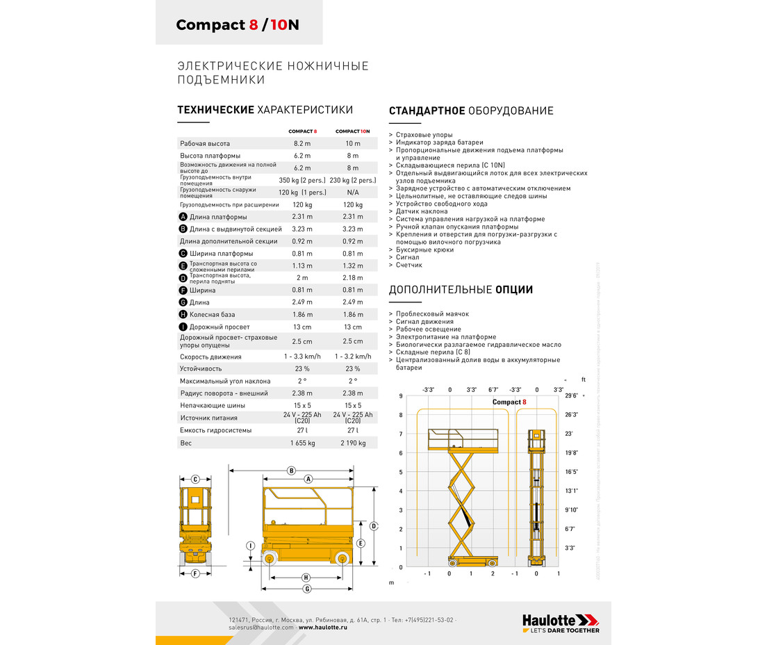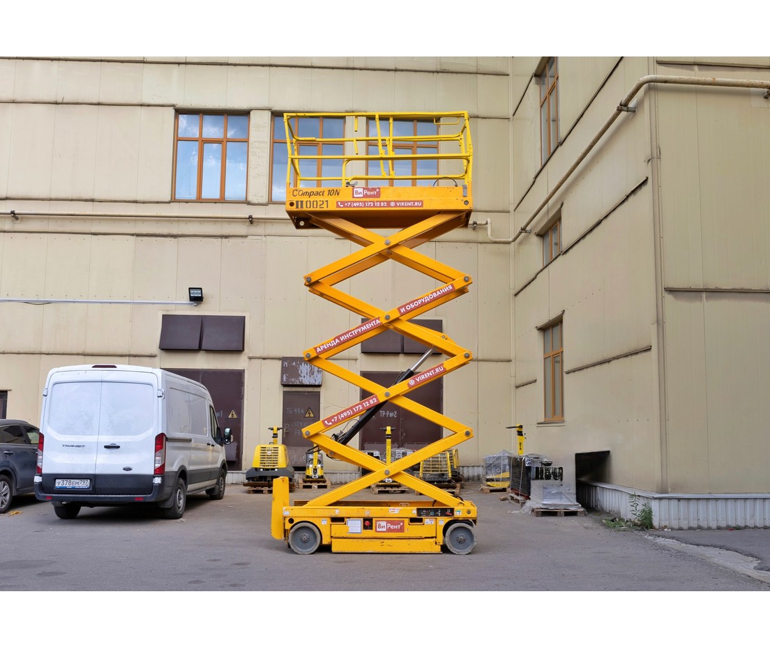 Модель Compact 10N довольна маневренна - 2 рулевых колеса позволяют управлять машиной прямо с рабочей платформы. При этом подъемник демонстрирует весьма высокие технические характеристики: грузоподъемность - 230 кг, рабочая высота - 10 метров. Подобное внушительное раскрытие ножничного подъемного механизма делает эту модель отличной помощницей, например, в логистике или на спортивных мероприятиях.