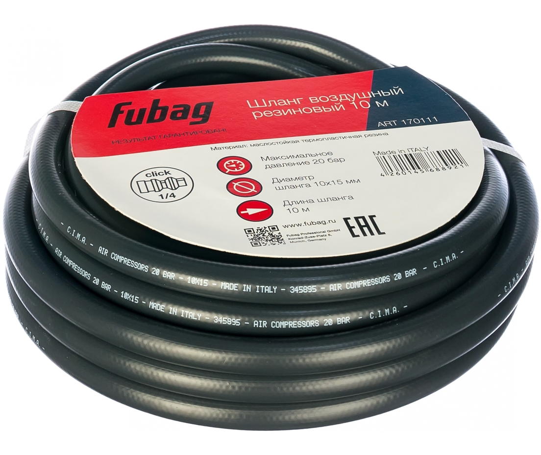 Шланг FUBAG 170111 служит удлинителем между компрессором и рабочим инструментом. Достаточная длина оснастки позволяет осуществлять работы на нужном расстоянии от компрессора. Шланг оснащен фитингами — рапид.