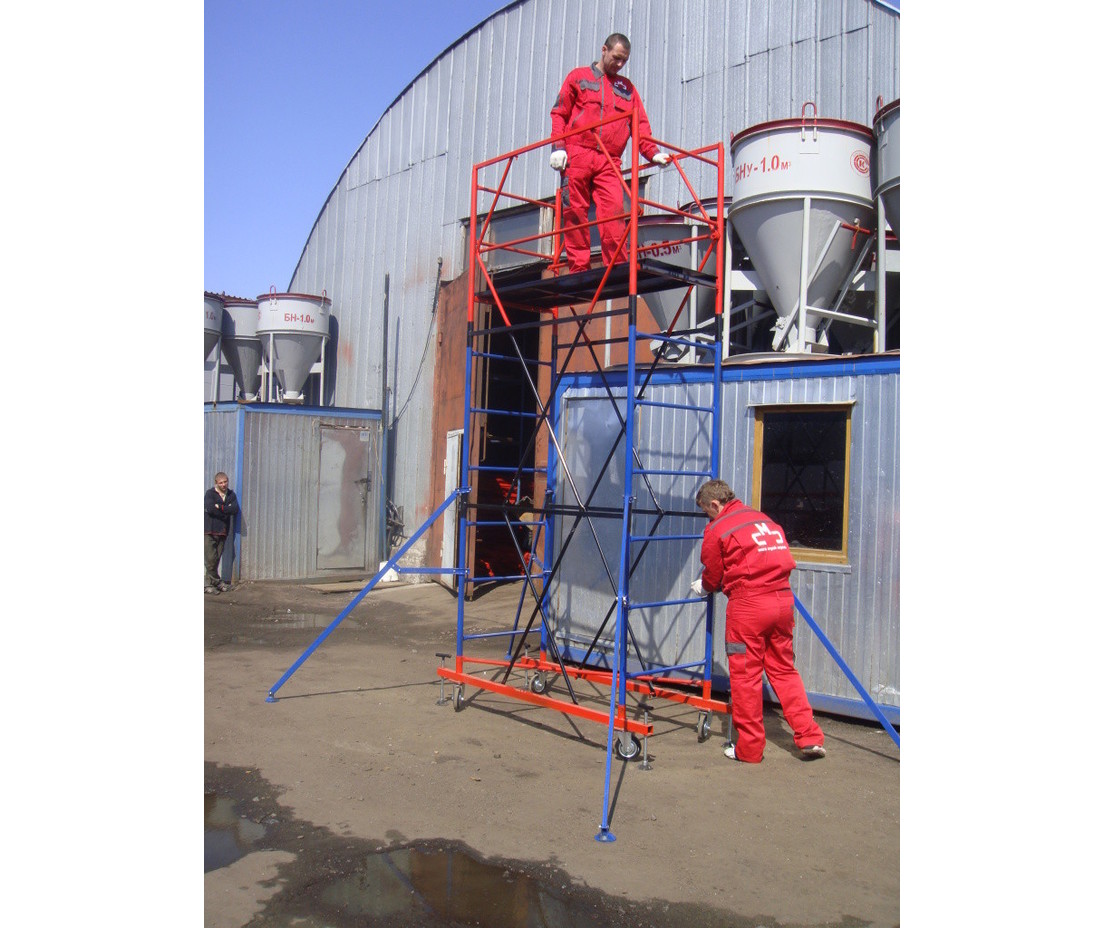 Благодаря вышке-туре рабочий и материал располагаются непосредственно в зоне проводимых работ. Нормативная поверхностная нагрузка - 200кг/м2.