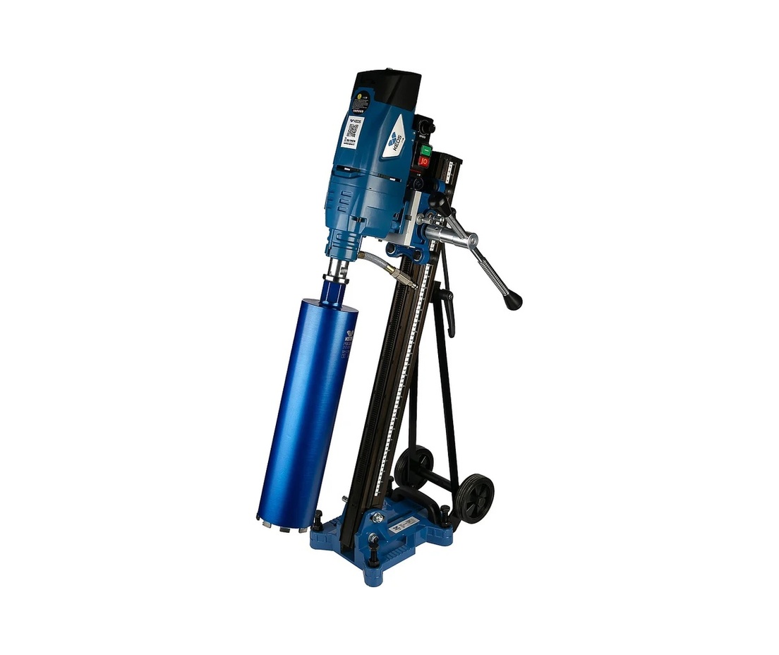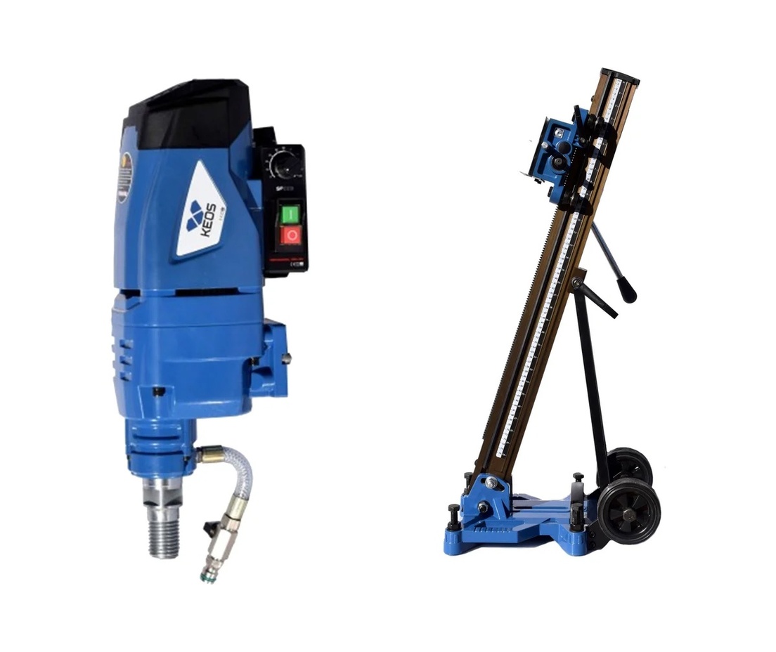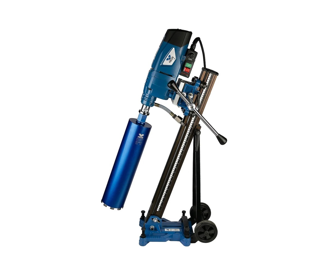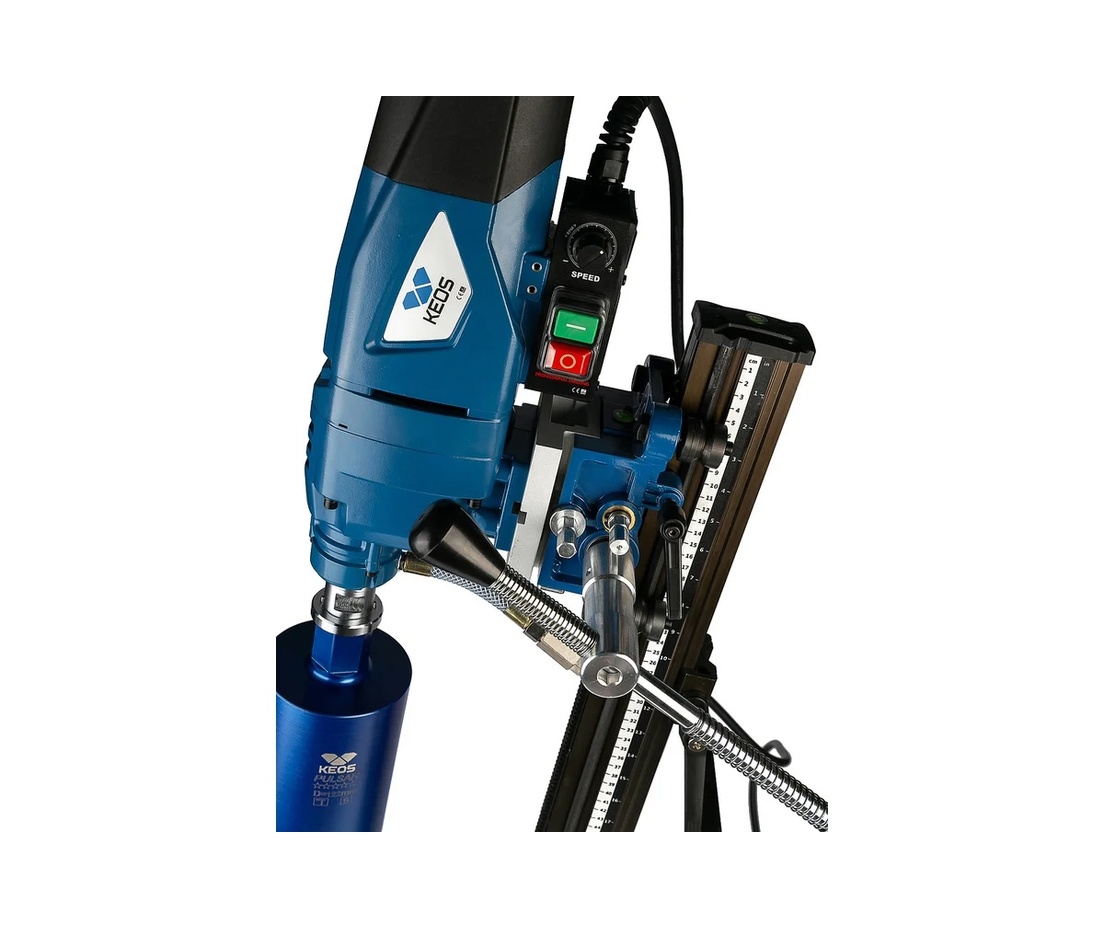 - Ряд механических и электронных защит двигателя и редуктора. Электронная регулировка оборотов позволяет контролировать вращение алмазной коронки при забуривании и прохождении пустот. Быстрая и лёгкая смена наклона штатива